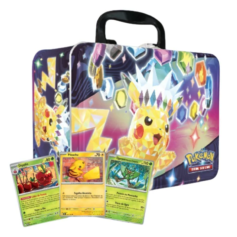 Esse baú de Metal do Pikachu, além de ser uma lancheira incrível, vem recheado de produtos de Pokémon TCG: